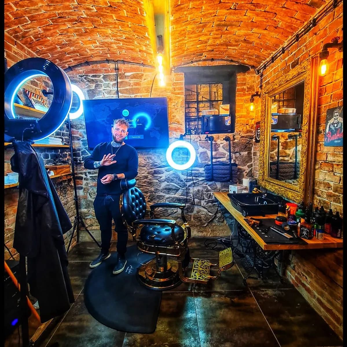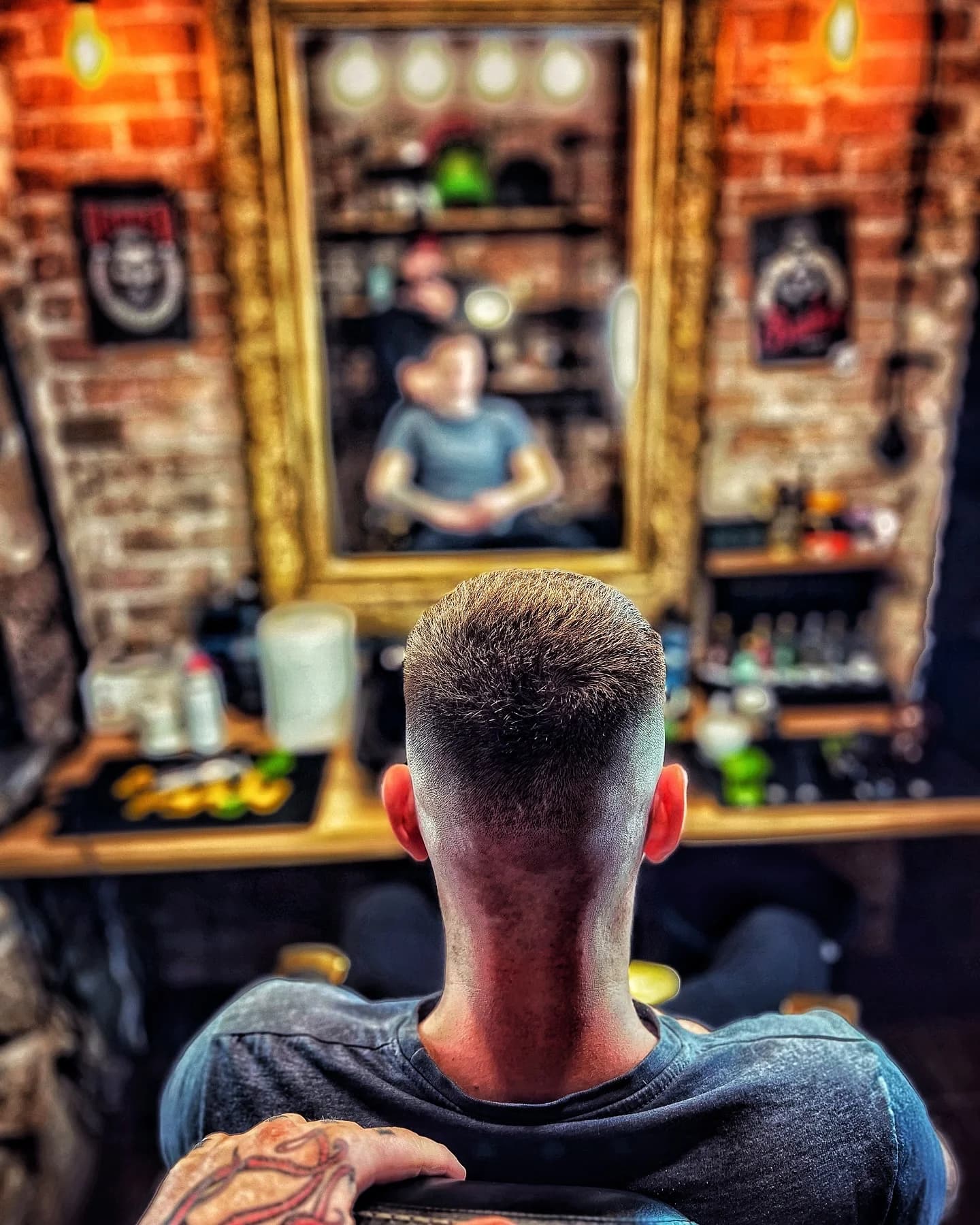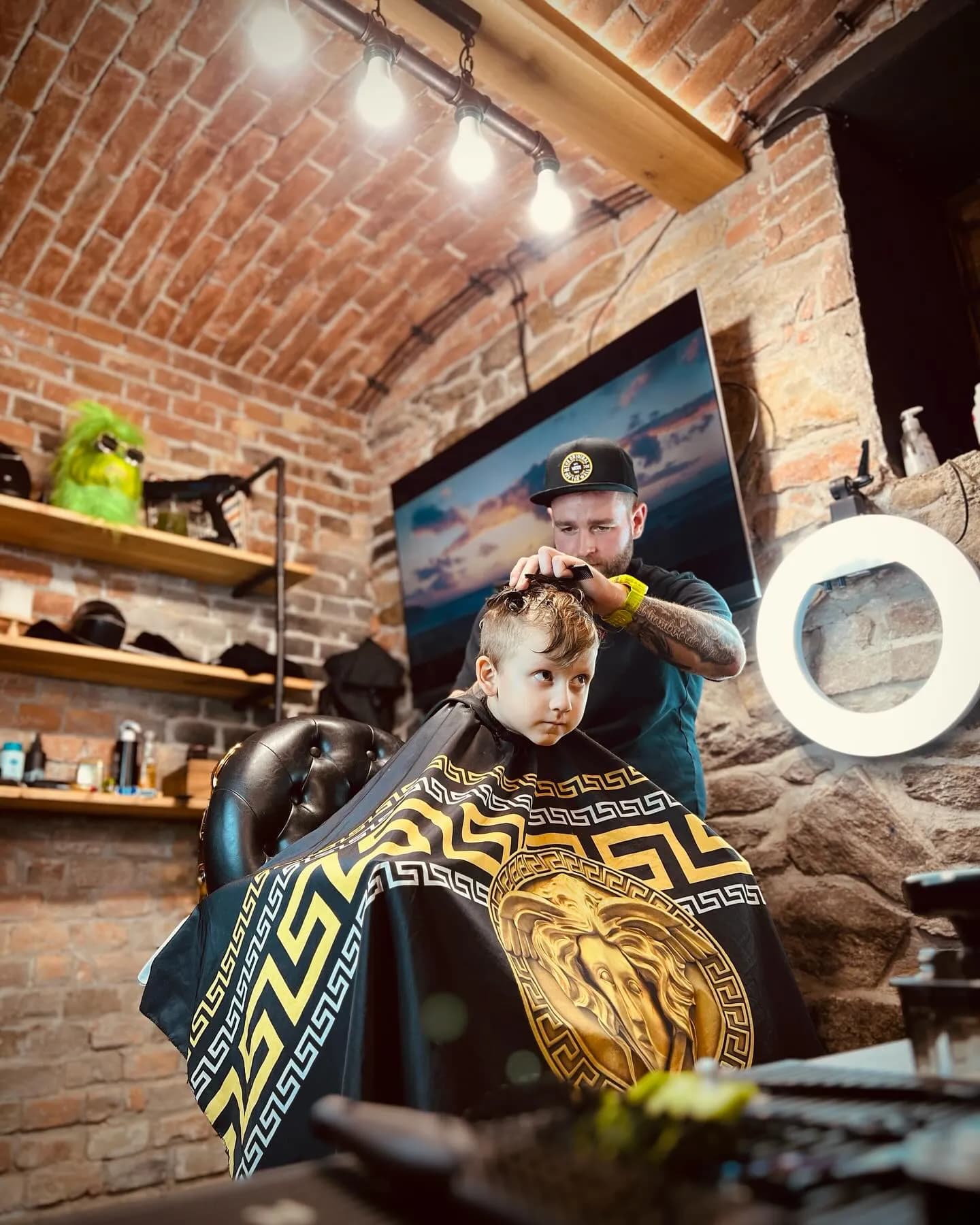 Přesný fade, čisté linky, vousy rovně jak podle pravítka. A když vedle sedí tvůj syn, učíš ho, jak má vypadat chlap.